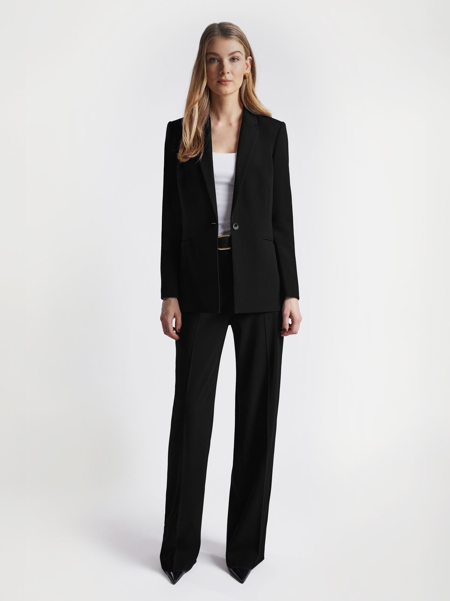 Pantalon long à jambe large en crêpe satin envers, taille mi-haute avec un tombé fluide.