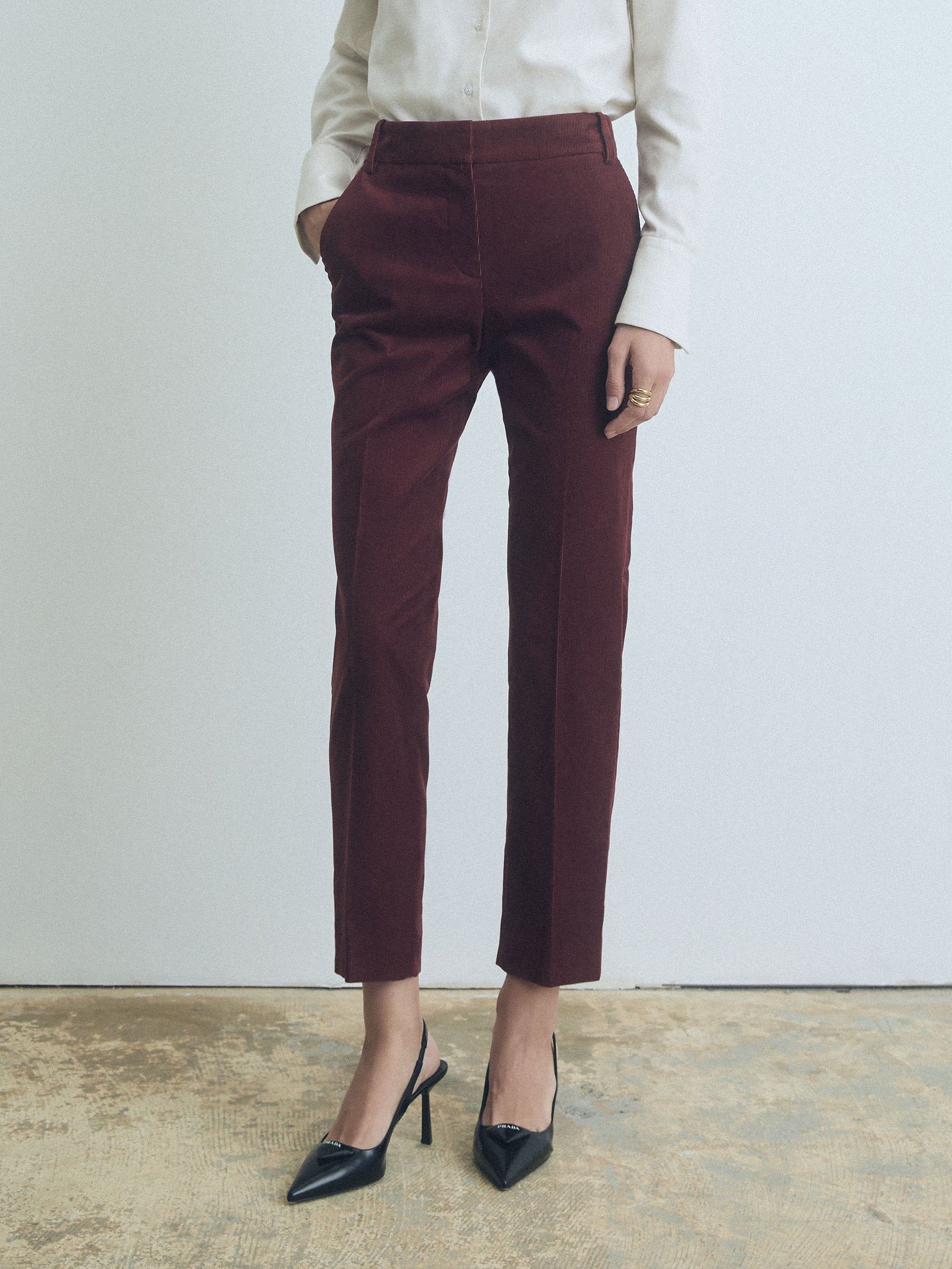 • Rust colored slim pant in unlined cotton stretch corduroy fabric by Judith & Charles