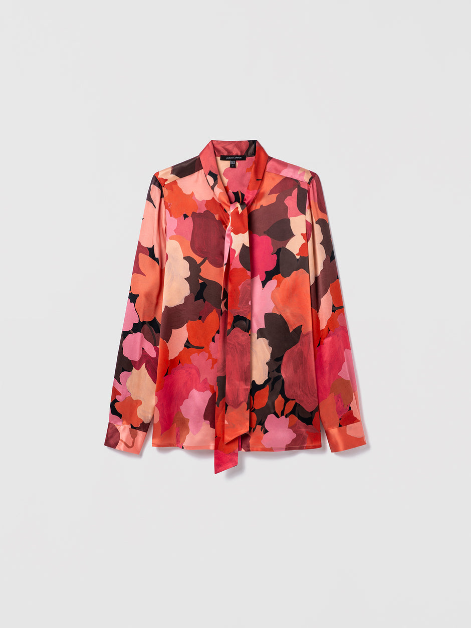 Blouse à manches longues en satin imprimé Liberty avec lien au col. Fermeture dissimulée.
