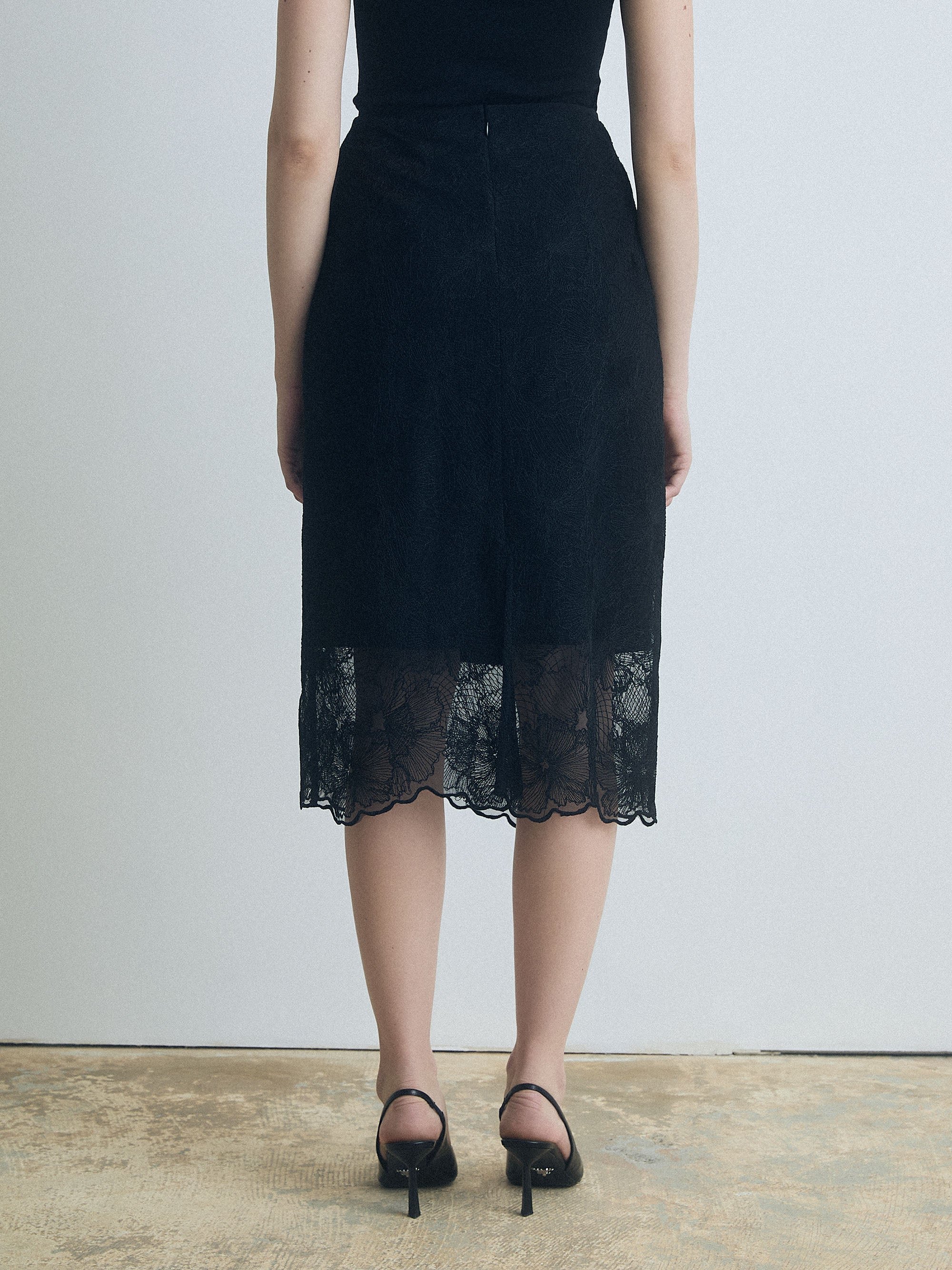Lace skirt with a scalloped hem and back slit. Clean waistband, invisible back zipper. Fully lined in 100% silk.
