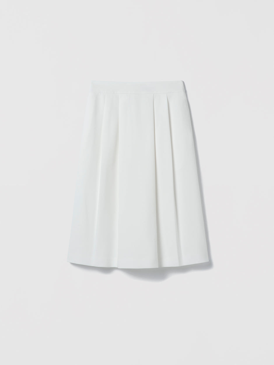 • Woman wearing a terracotta cardigan, black top, white skirt, and black sandals on a plain background