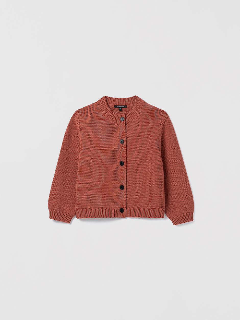 A clean crew‑neck cardigan in organic GOTS‑certified cotton. Finished with a button‑front closure.