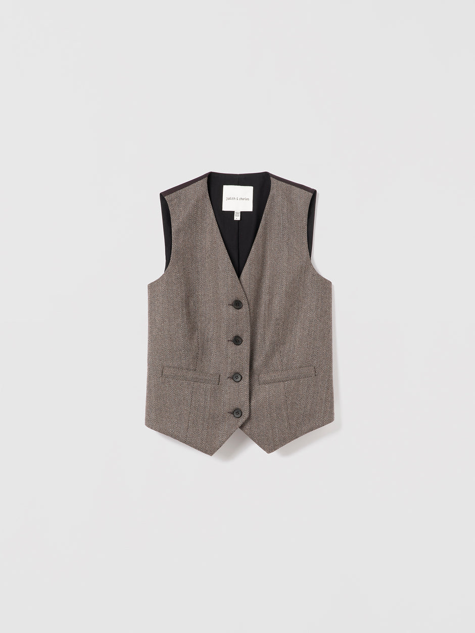 Double-breasted fitted herringbone wool jacket with peak lapel, flap and chest pockets, single back vent, fully lined, made in Canada from Italian fabric