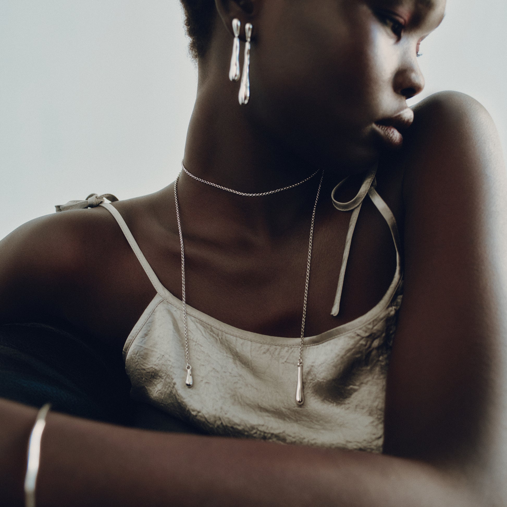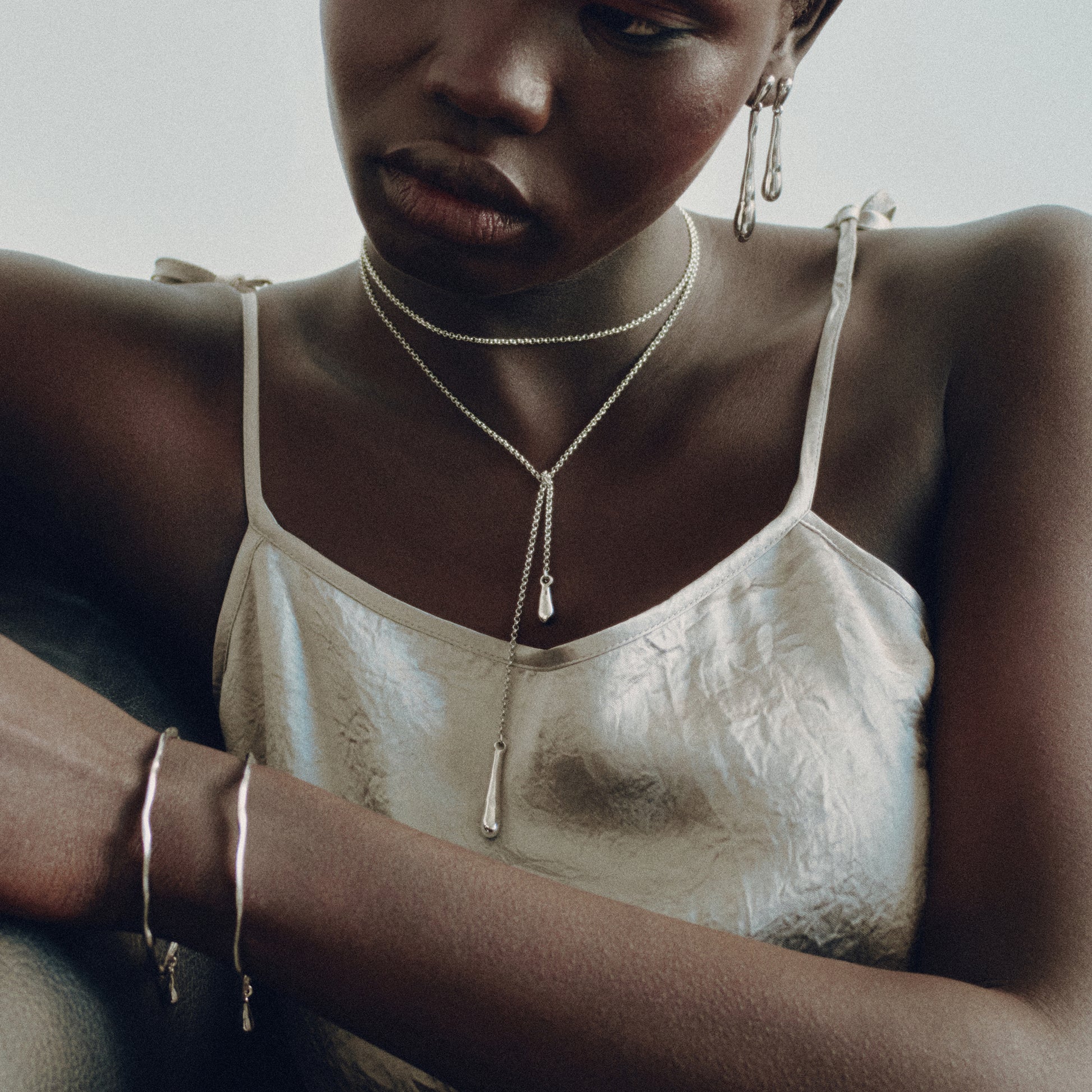 A duo of hand-formed molten droplets cascade from a minimal rolo chain, shifting effortlessly from cool-girl accent to everyday essential. This beauty is the ultimate multi-tasker—wear it long and tied, folded scarf-style for a shorter look, or wrapped once around for a chic choker effect. So many ways to wear, all yours to explore. Also available in gold. Rhodium plating, hypoallergenic Hand-cast & polished forms, rolo chainlink 34" chain Style: BK-W2503 Made with love in Toronto, Canada