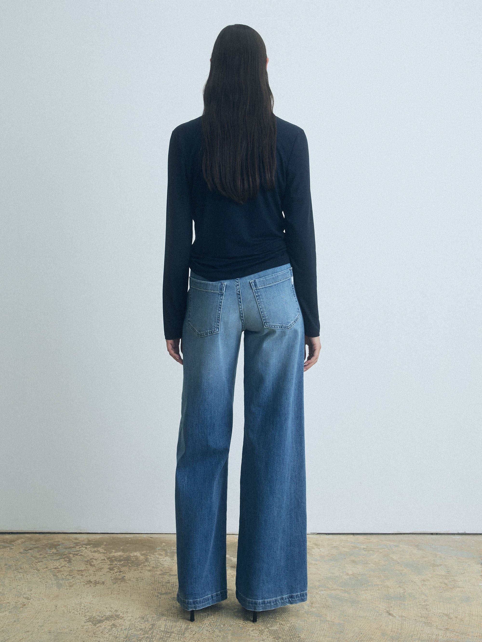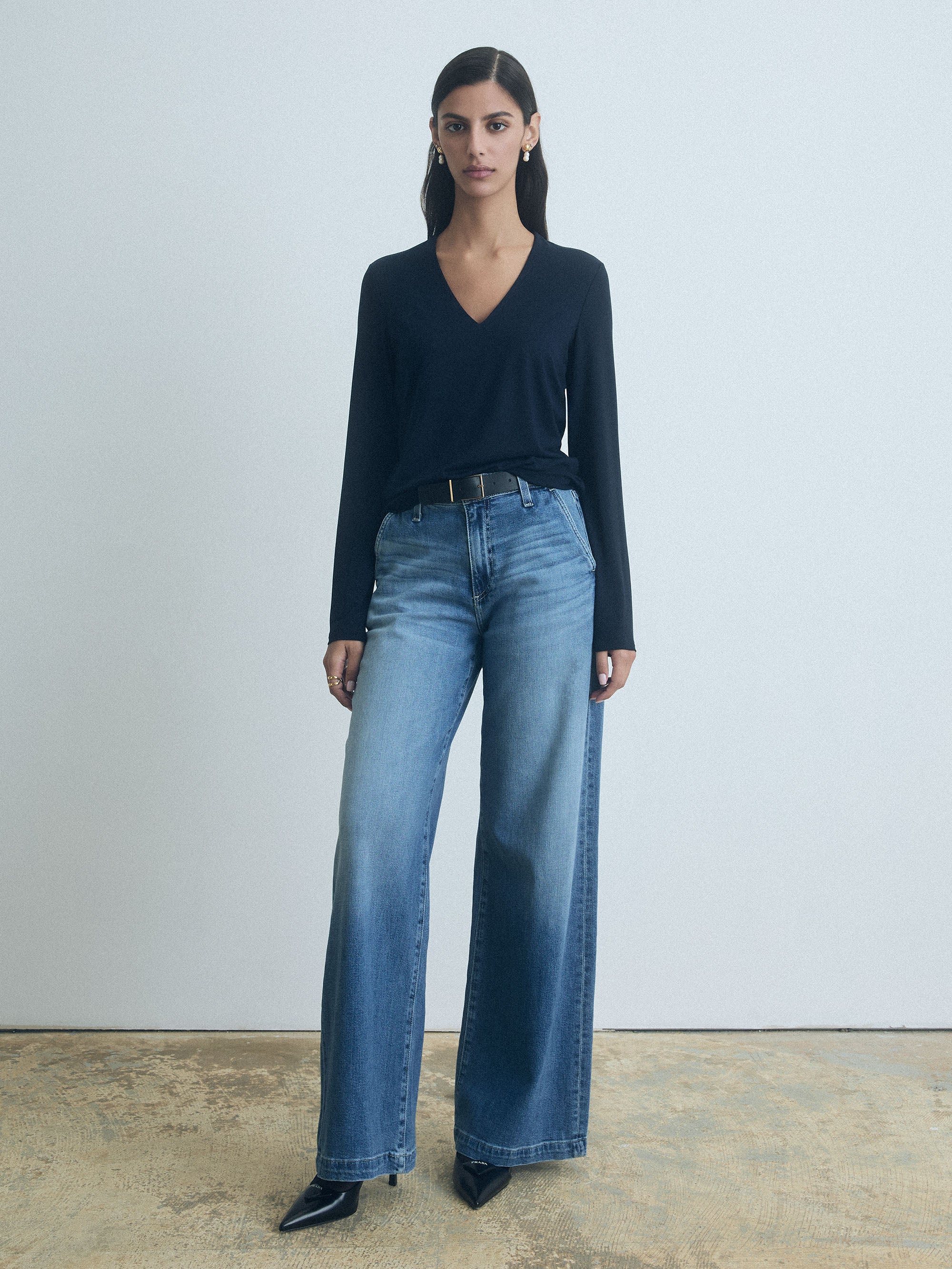 • Judith & Charles navy V-neck long-sleeve T-shirt in fluid viscose jersey, fitted silhouette.
