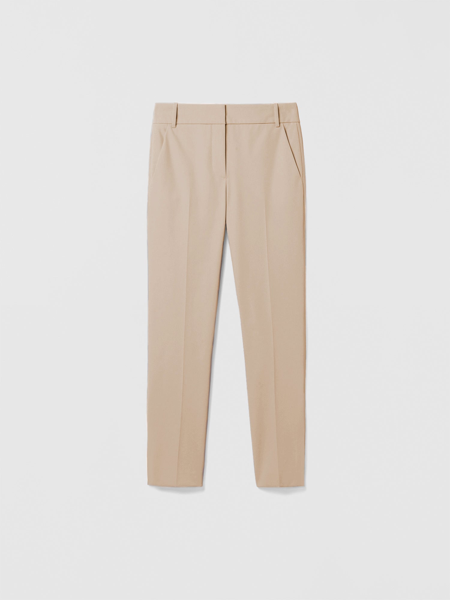 • A model wearing ankle length slim pants with mid-rise waist, featuring slash pockets, back welt pockets, hook and eye closure with zip, and belt loops in a beige color.