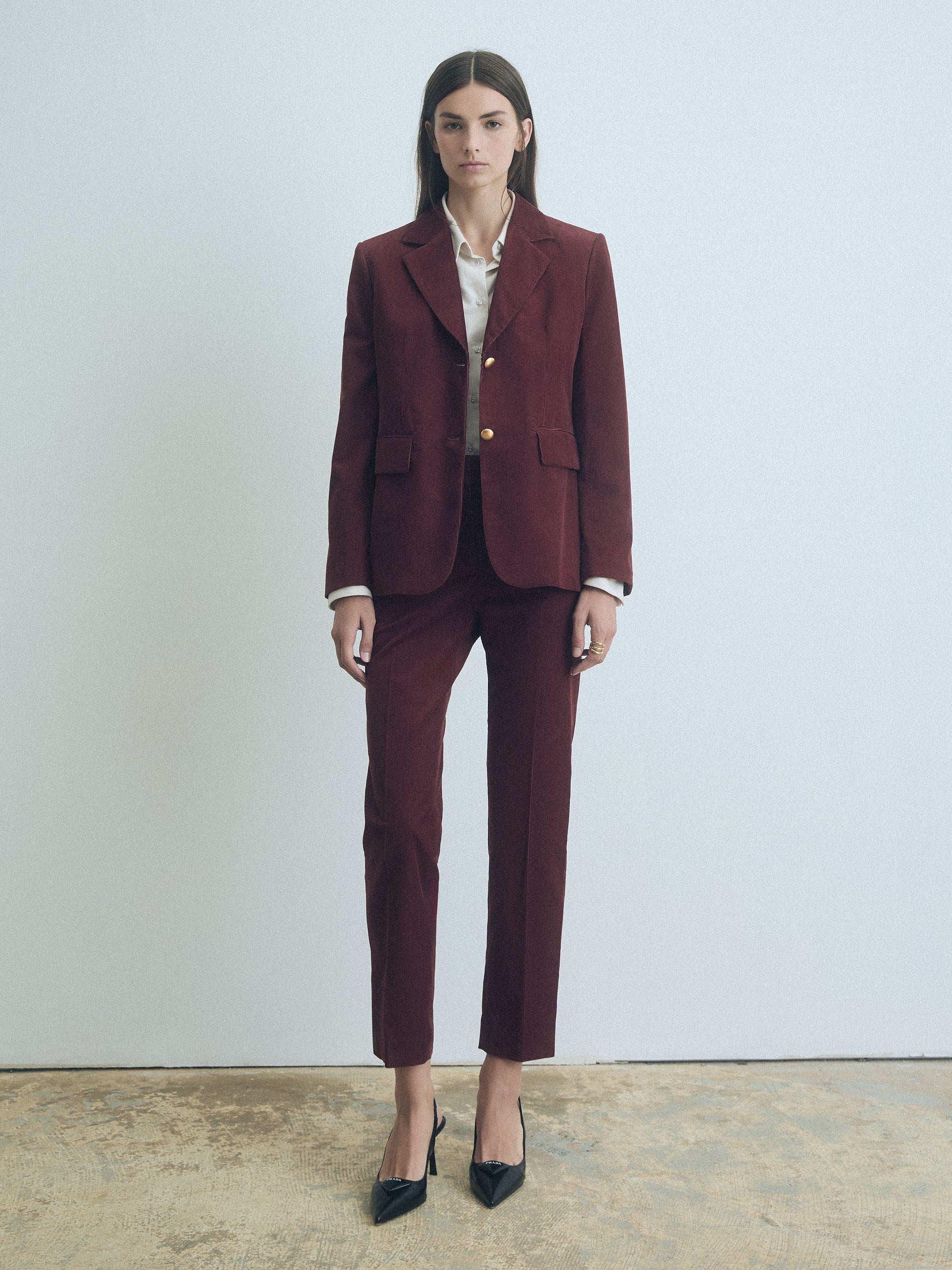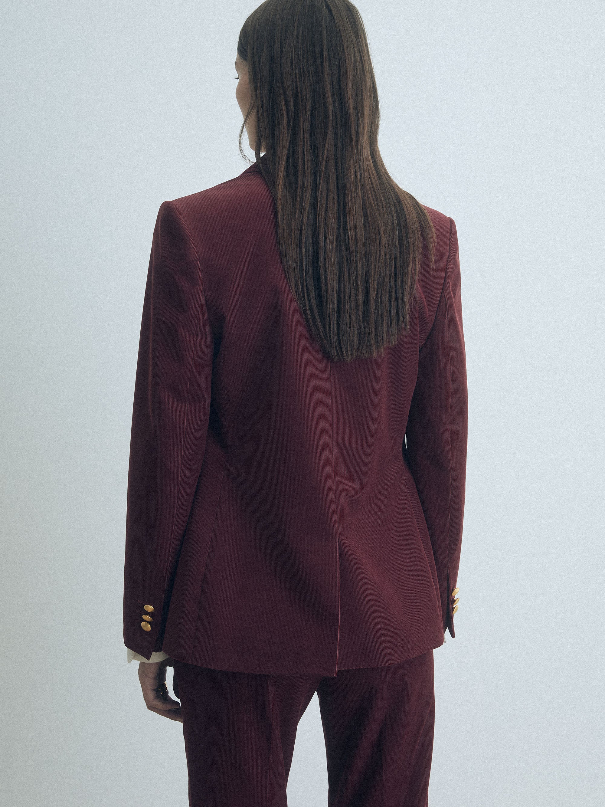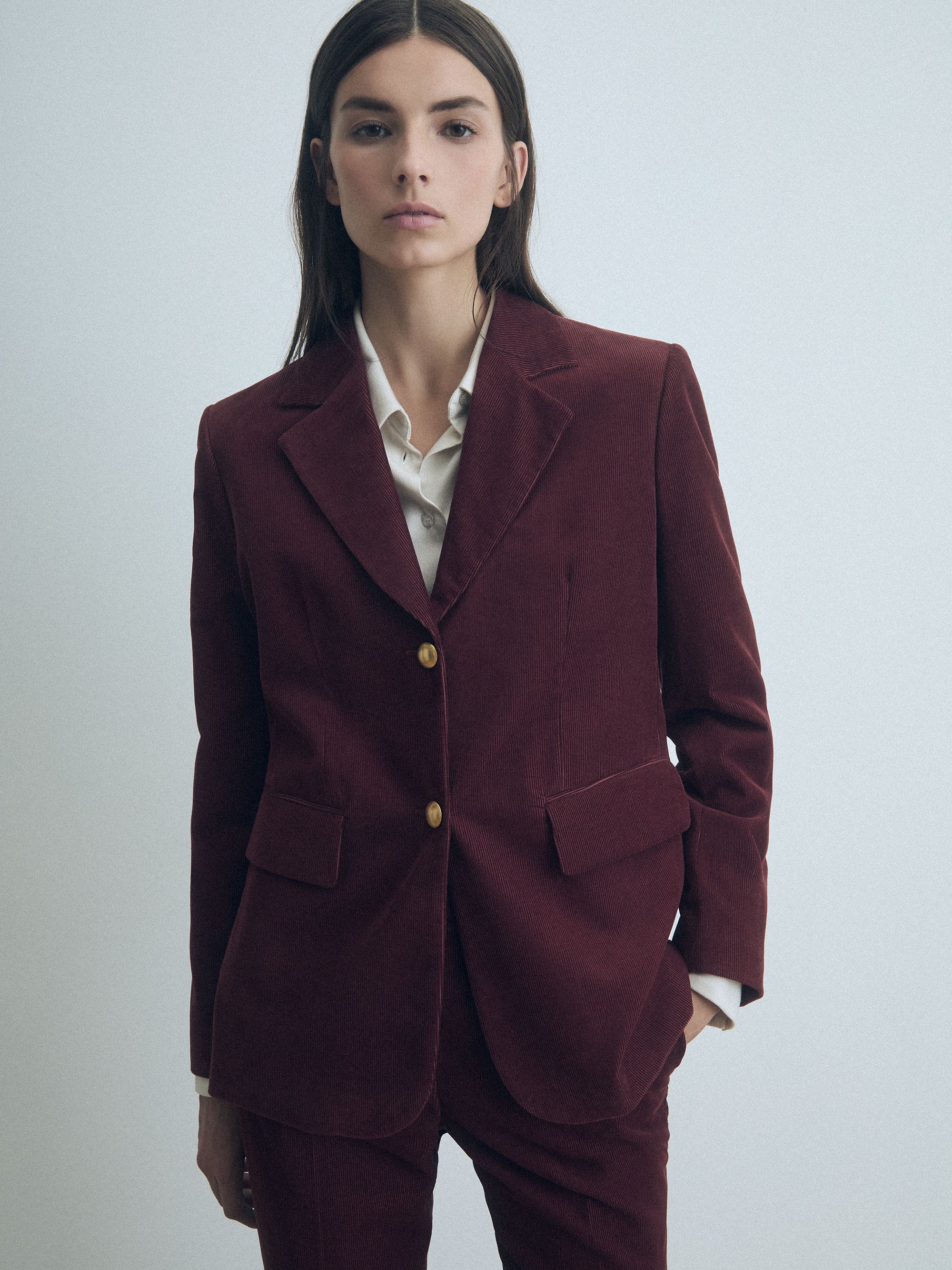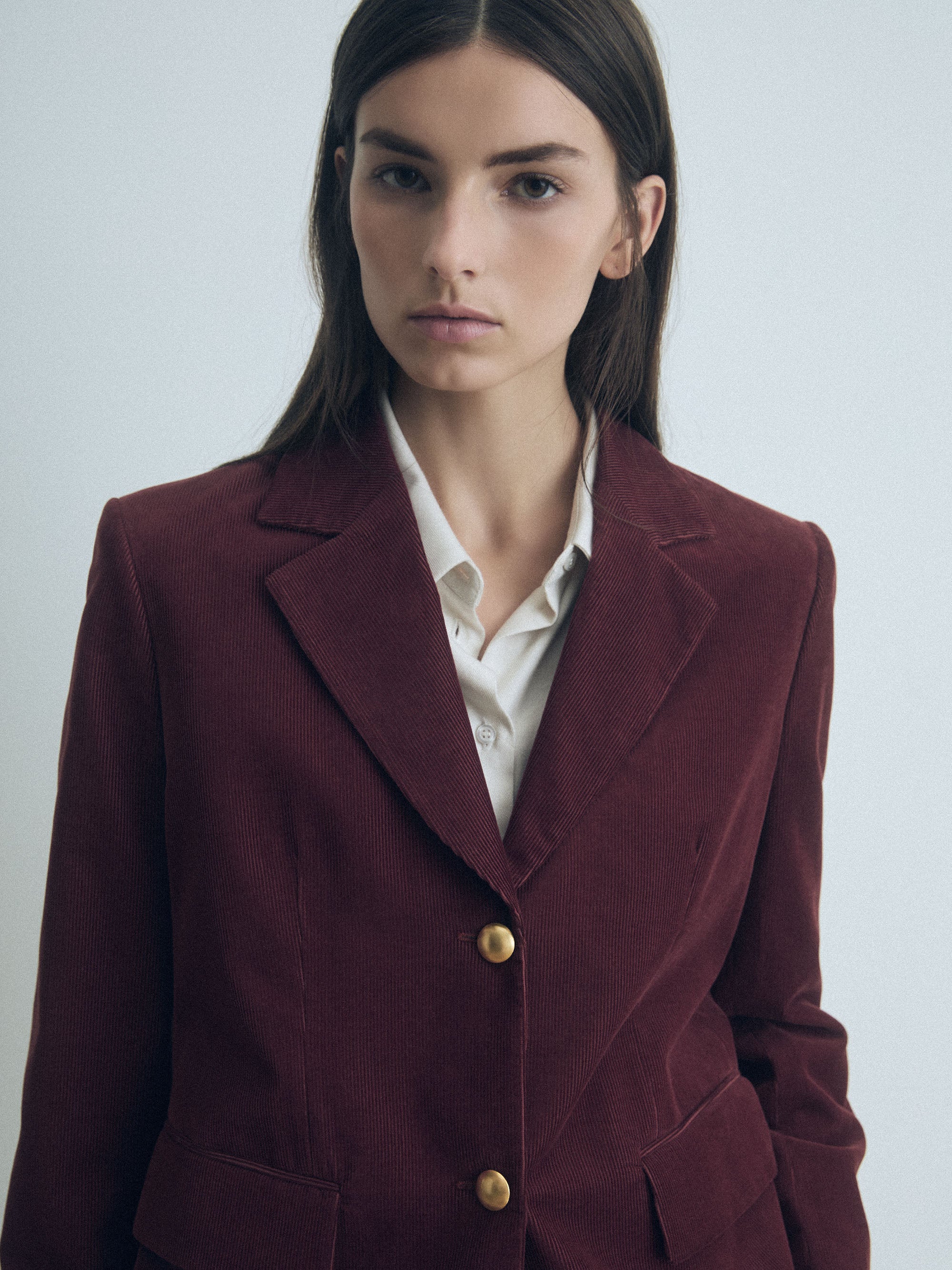 Stretch corduroy jacket with gold buttons and flap pockets. Fully lined.
