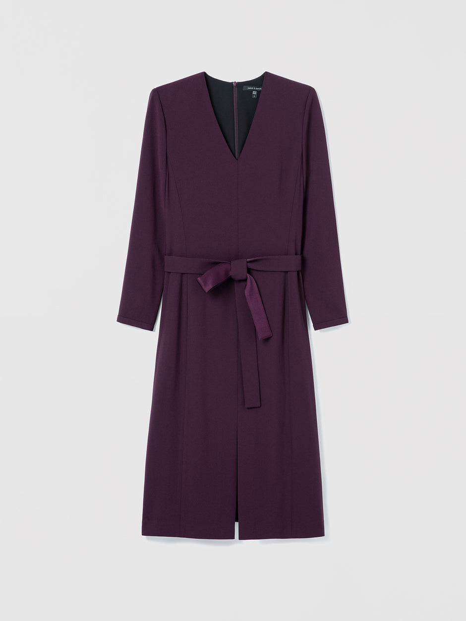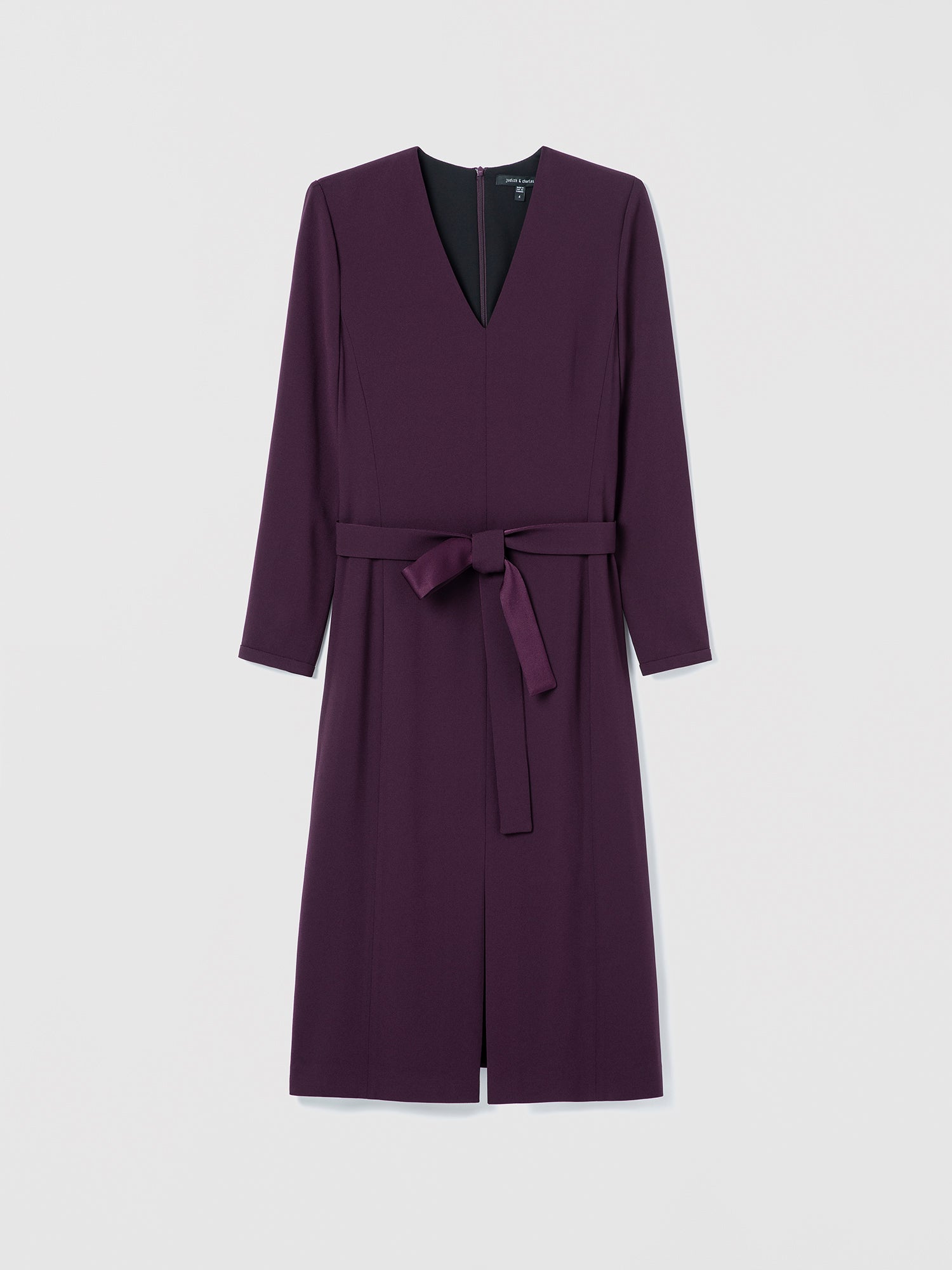Long sleeve V-neck dress with a self belt, front vent, and invisible back zip. Fully lined.