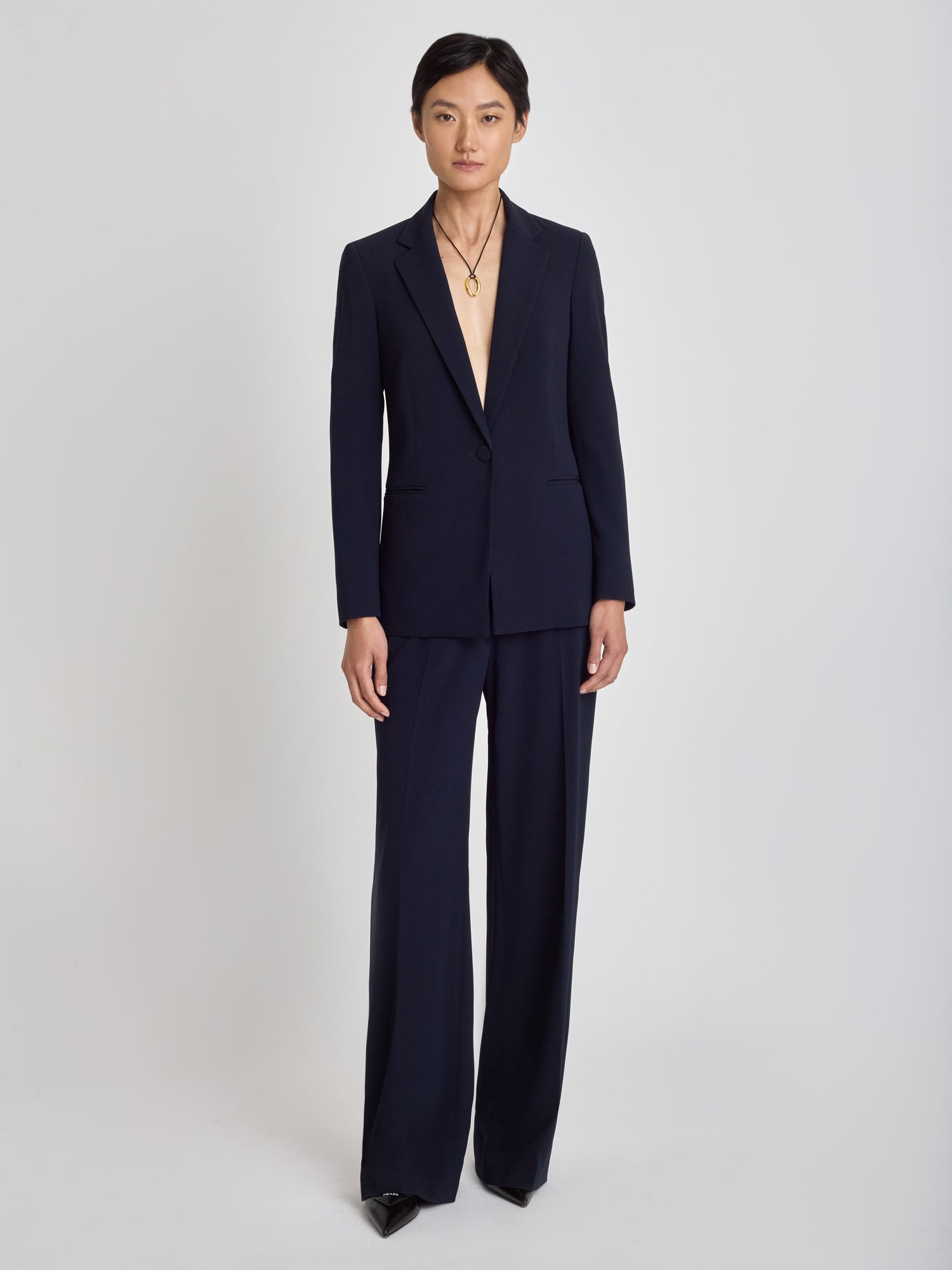 • Judith & Charles Navy full-length wide-leg pant in Satin Back Crepe with a mid-rise fit. Features slash pockets, back welt pockets, clean waistband, and hook-and-eye closure with zip. Unlined, 33-inch inseam. Made in Canada with Japanese fabric. Style: Parme Pant