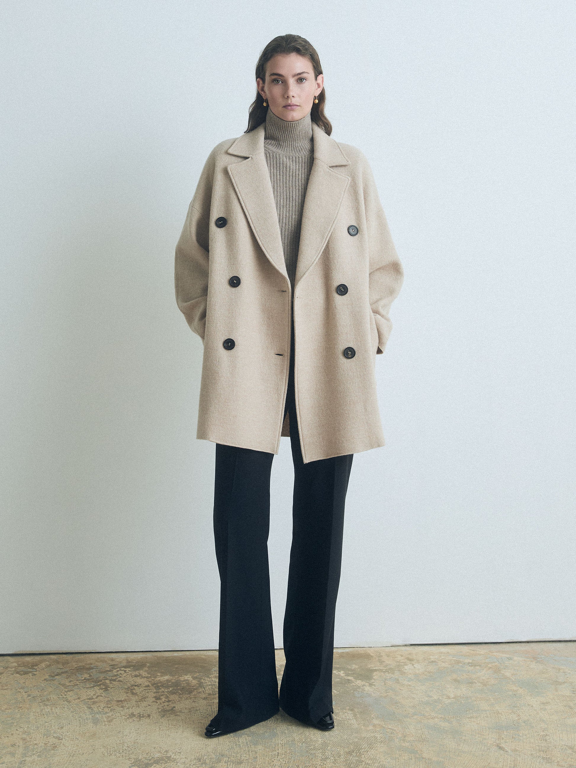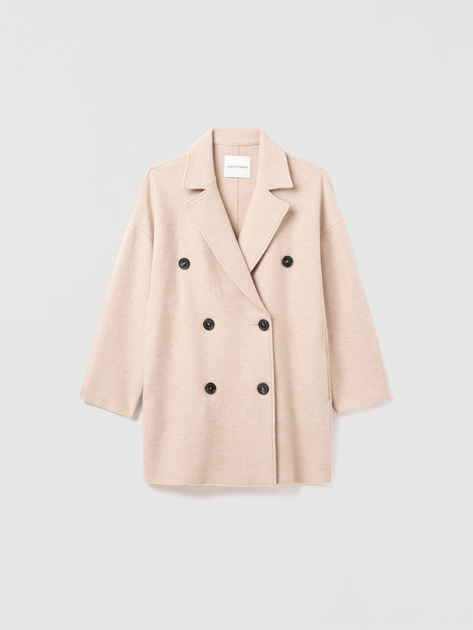 • Judith & Charles wheat-colored double-breasted boiled wool coat, made in Canada.