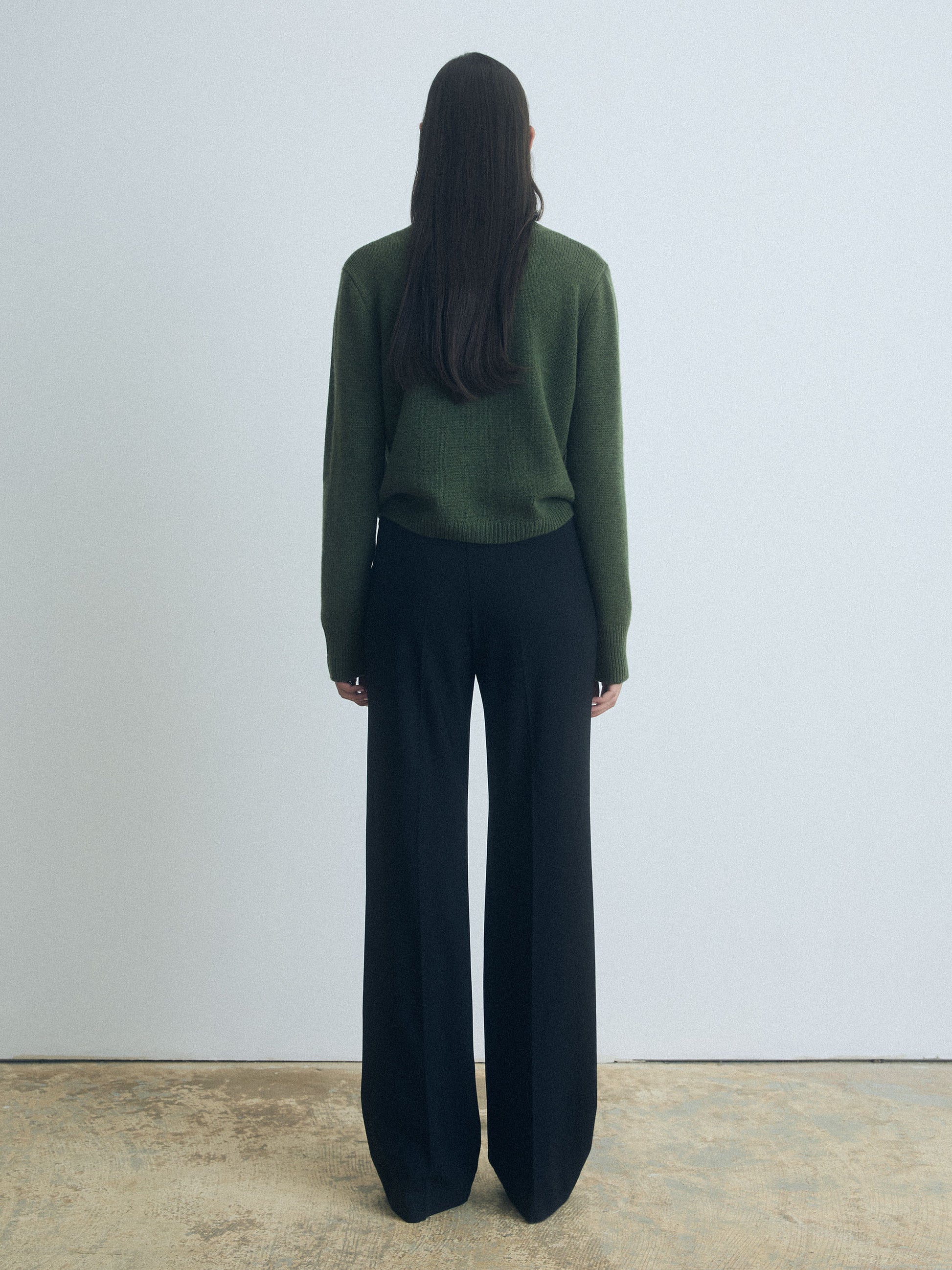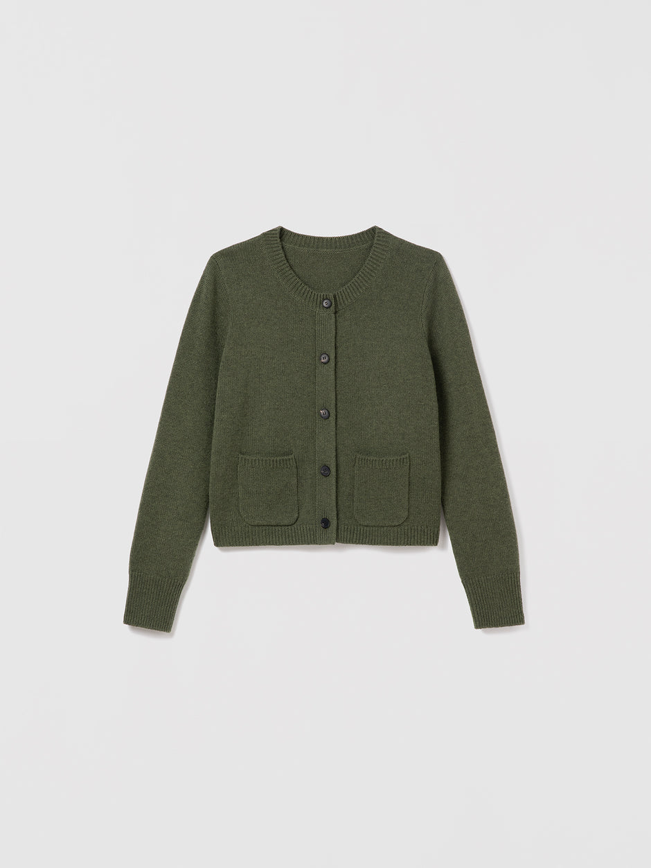 • Avocado wool-cashmere blend cardigan with crew neck, button front, and two patch pockets by Judith & Charles.