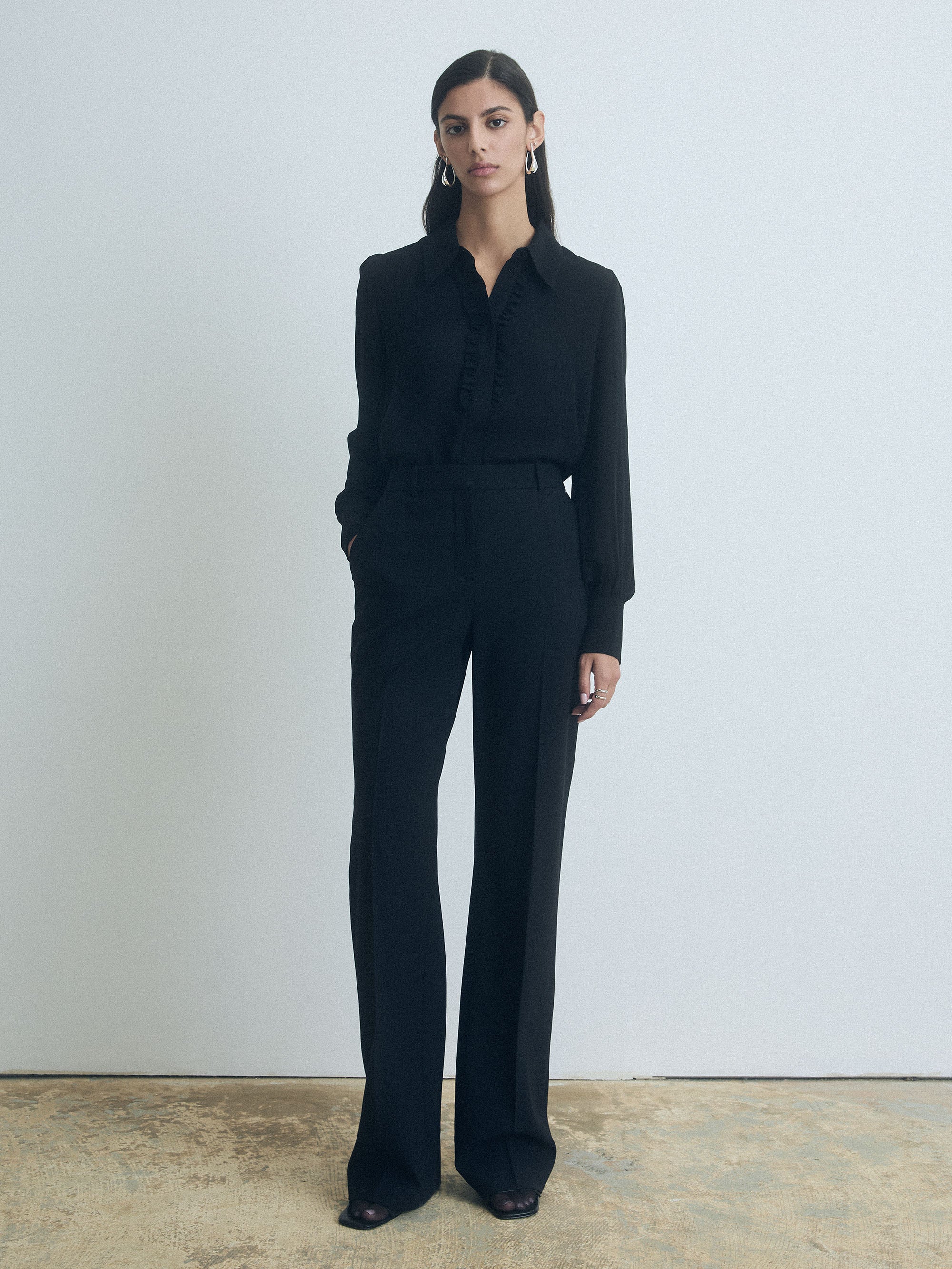 Silk blouse with a classic shirt collar and concealed button placket. Features a ruffle detail at the front.