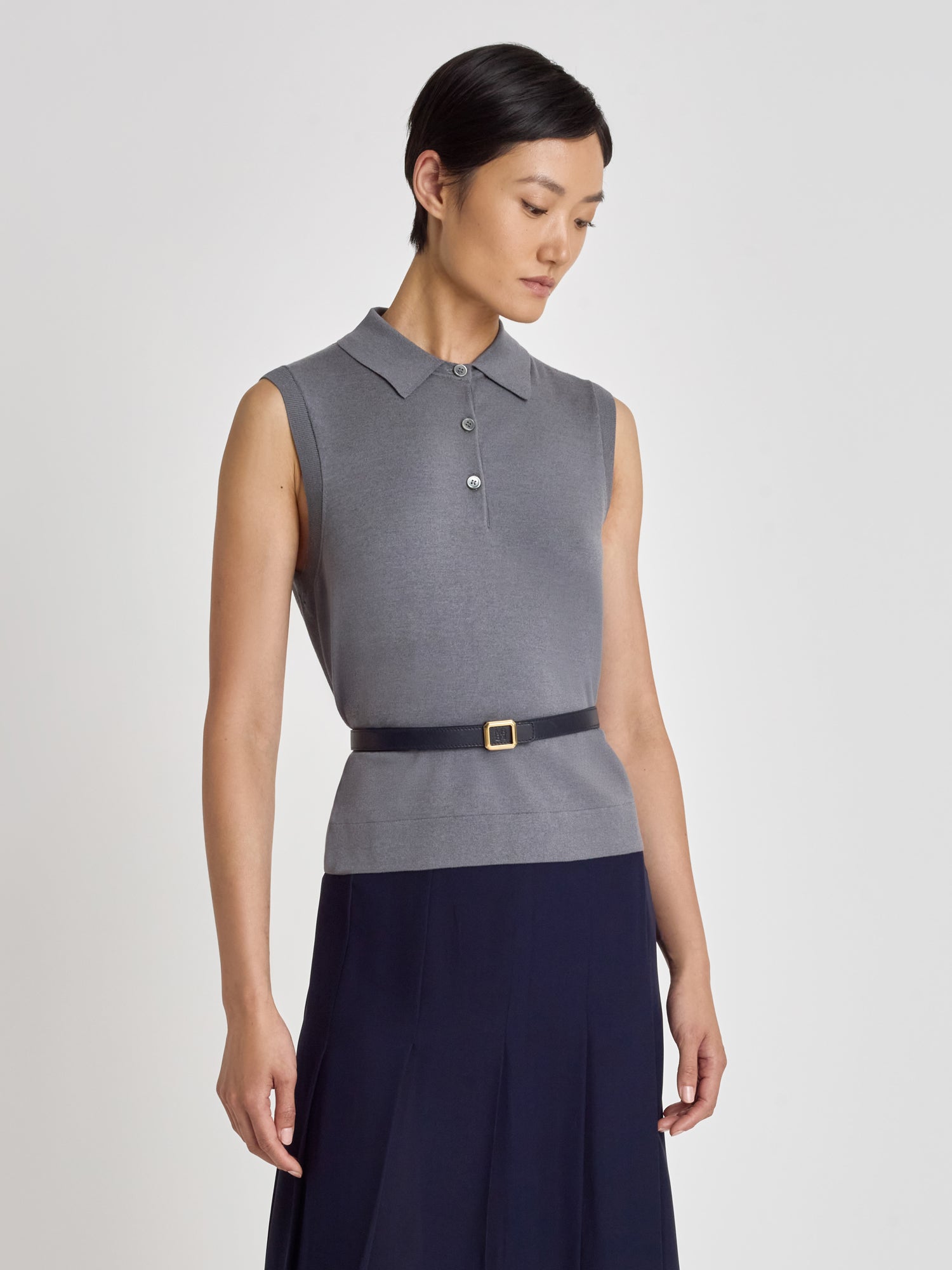 Silk-cotton sleeveless polo with a polo collar, 3-button front, and easy fit.