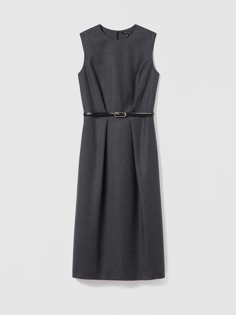 Sleeveless wool dress with crew neck, back slit, and leather belt. Invisible back zip.