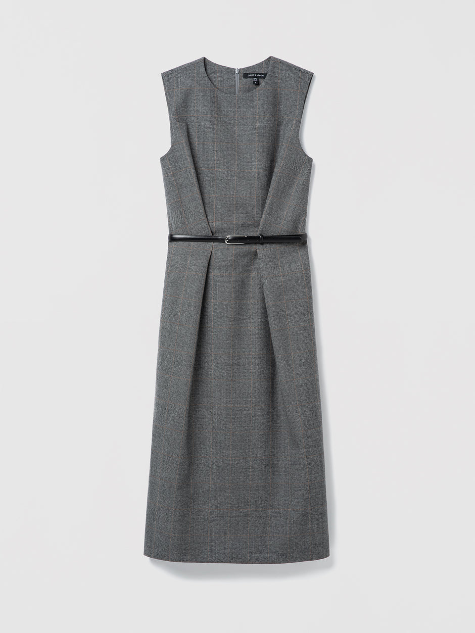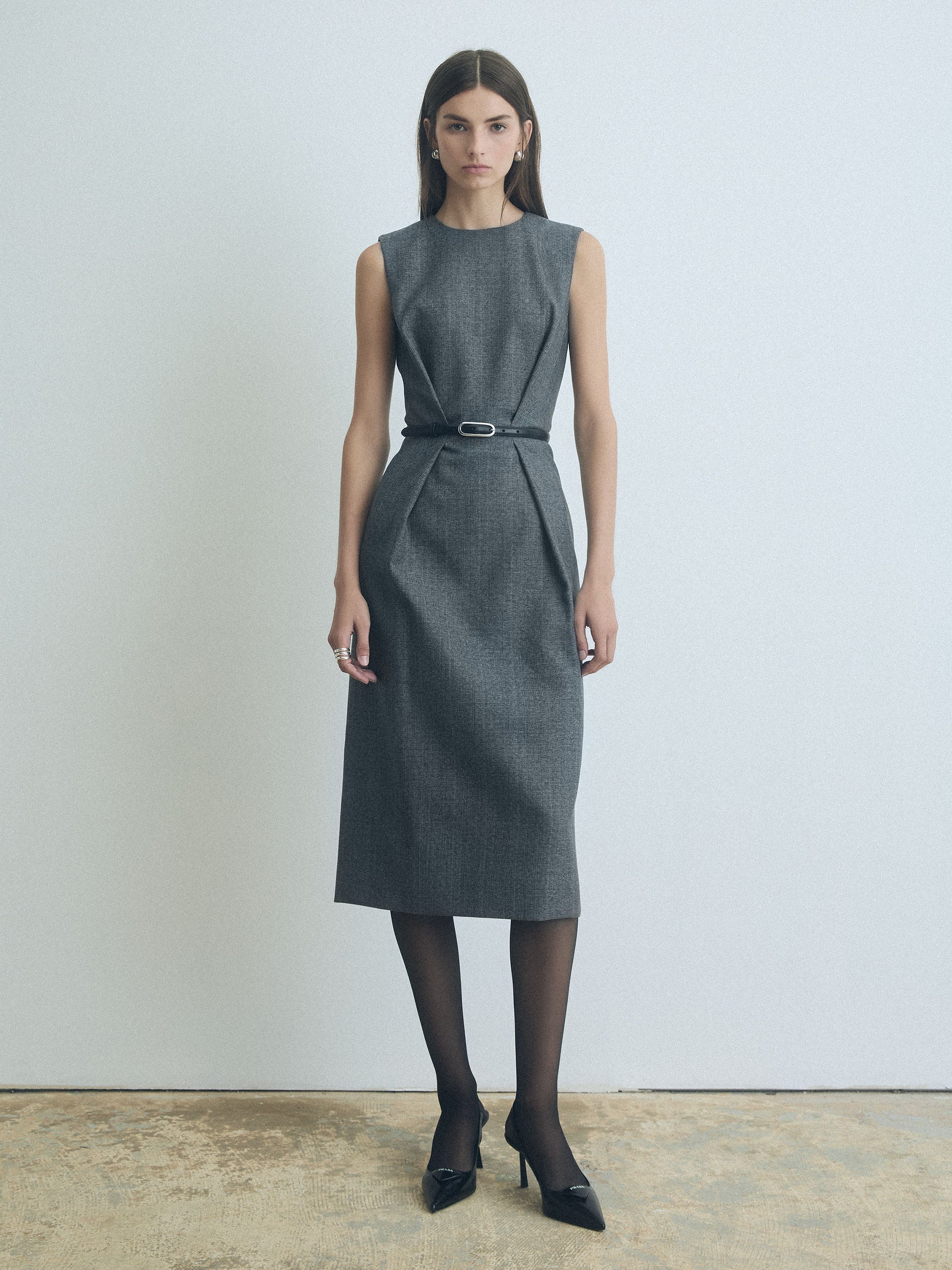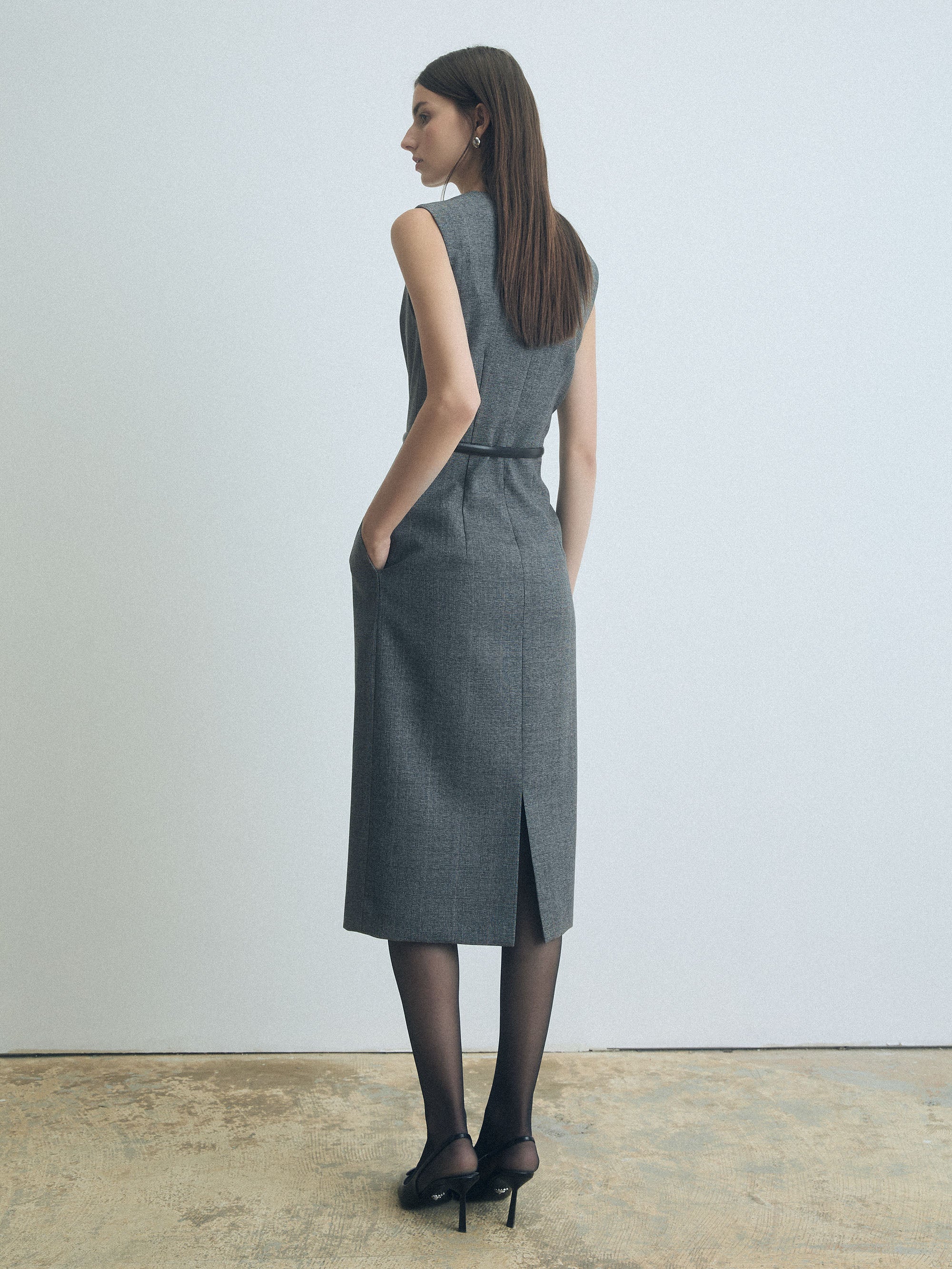 Sleeveless wool dress with crew neck, back slit, and leather belt. Invisible back zip.