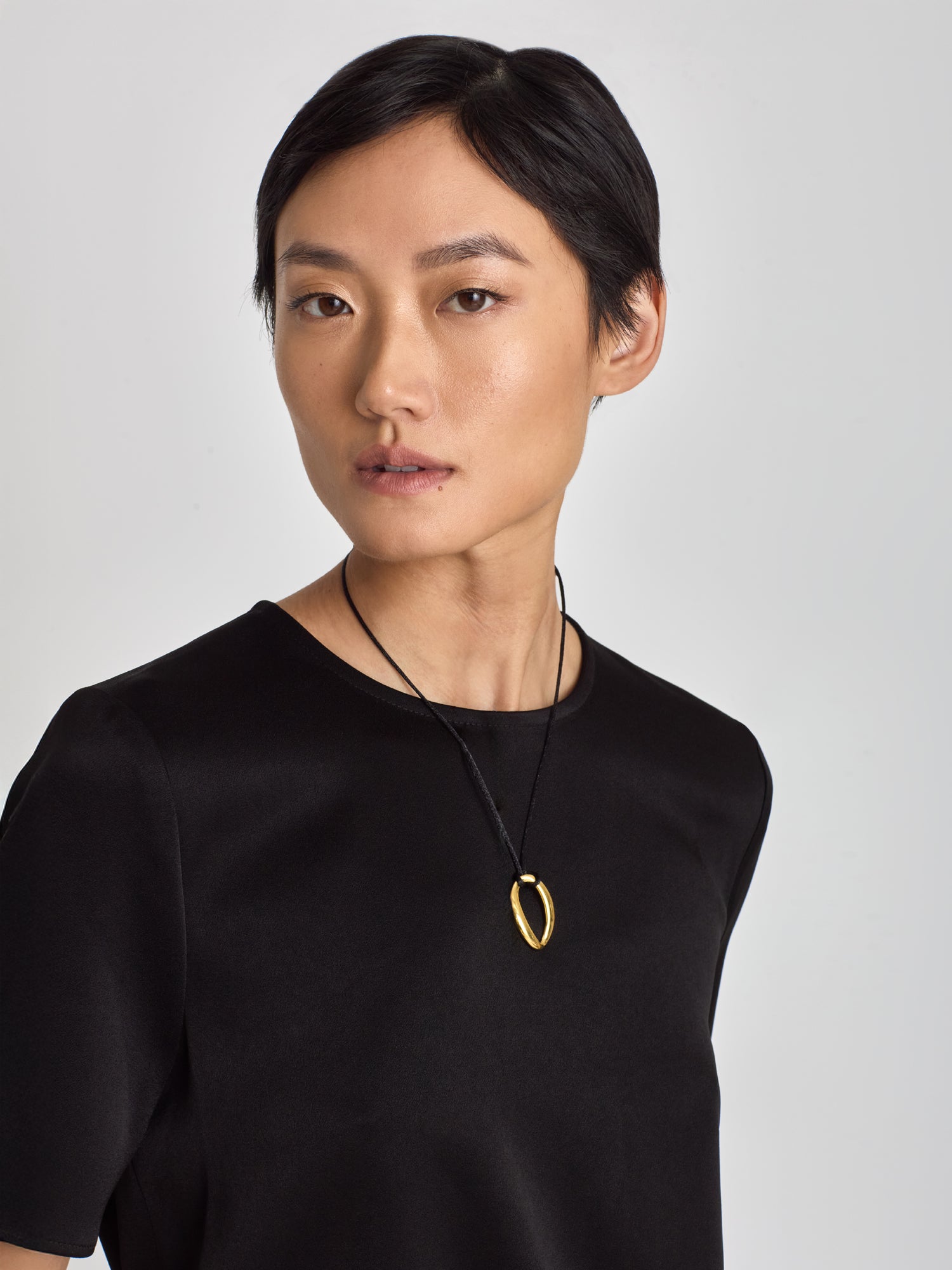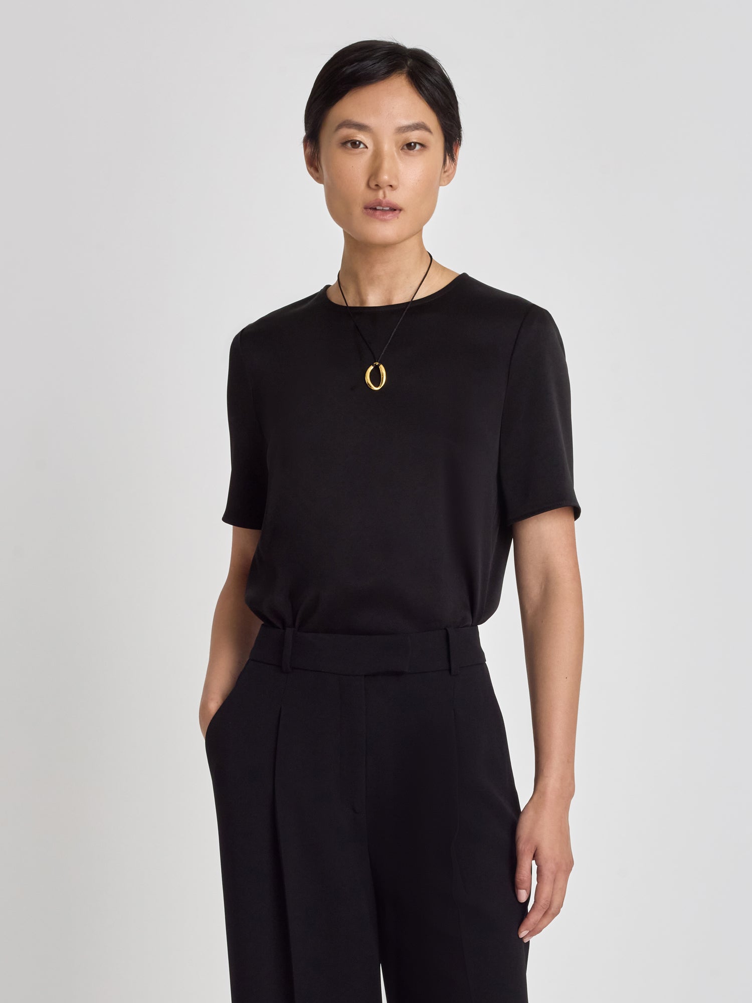 Short-sleeve crew neck blouse in satin back crepe, featuring a boxy silhouette and keyhole button closure at the back.