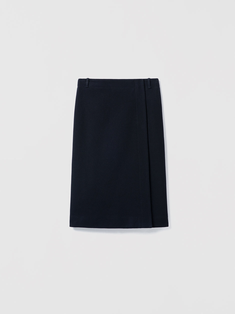 • Woman wearing a white top and black skirt against a plain background