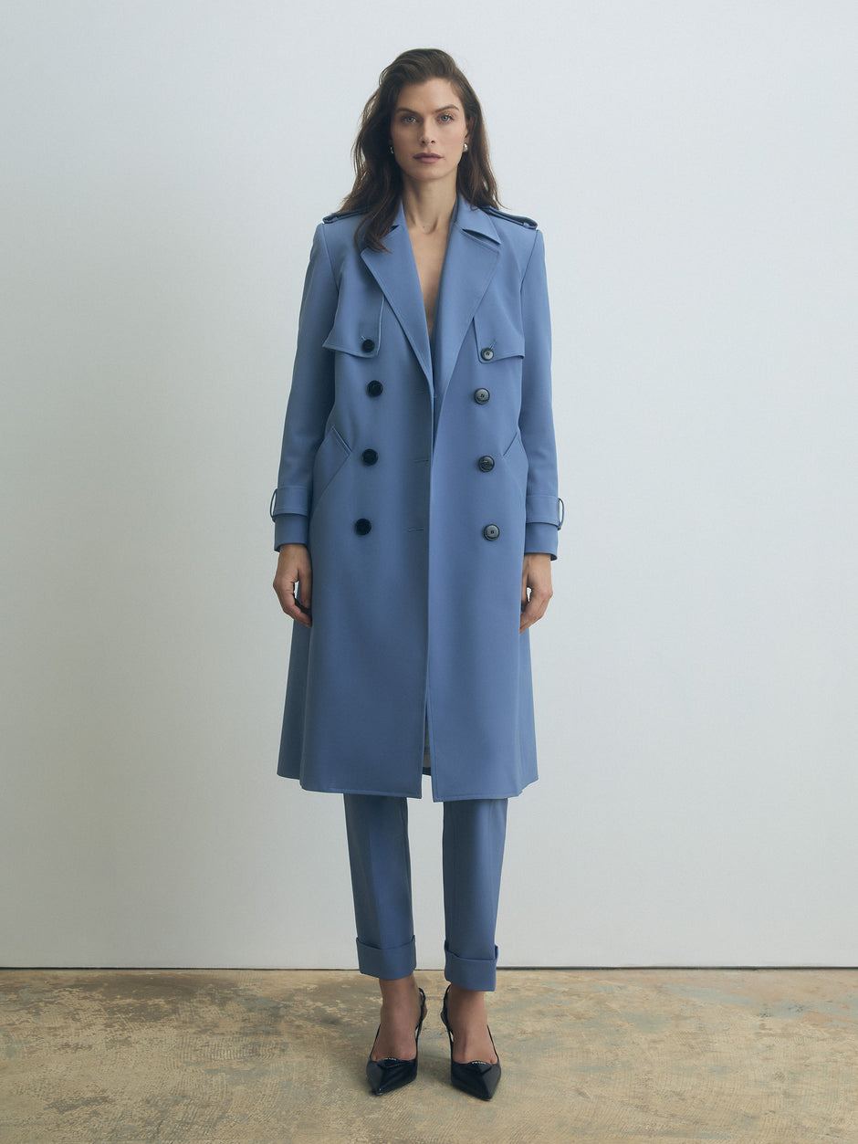 Double-breasted fitted jacket in fine wool with a tonal pinstripe, featuring peak lapels, a welt chest pocket, two front flap pockets, and a back vent.