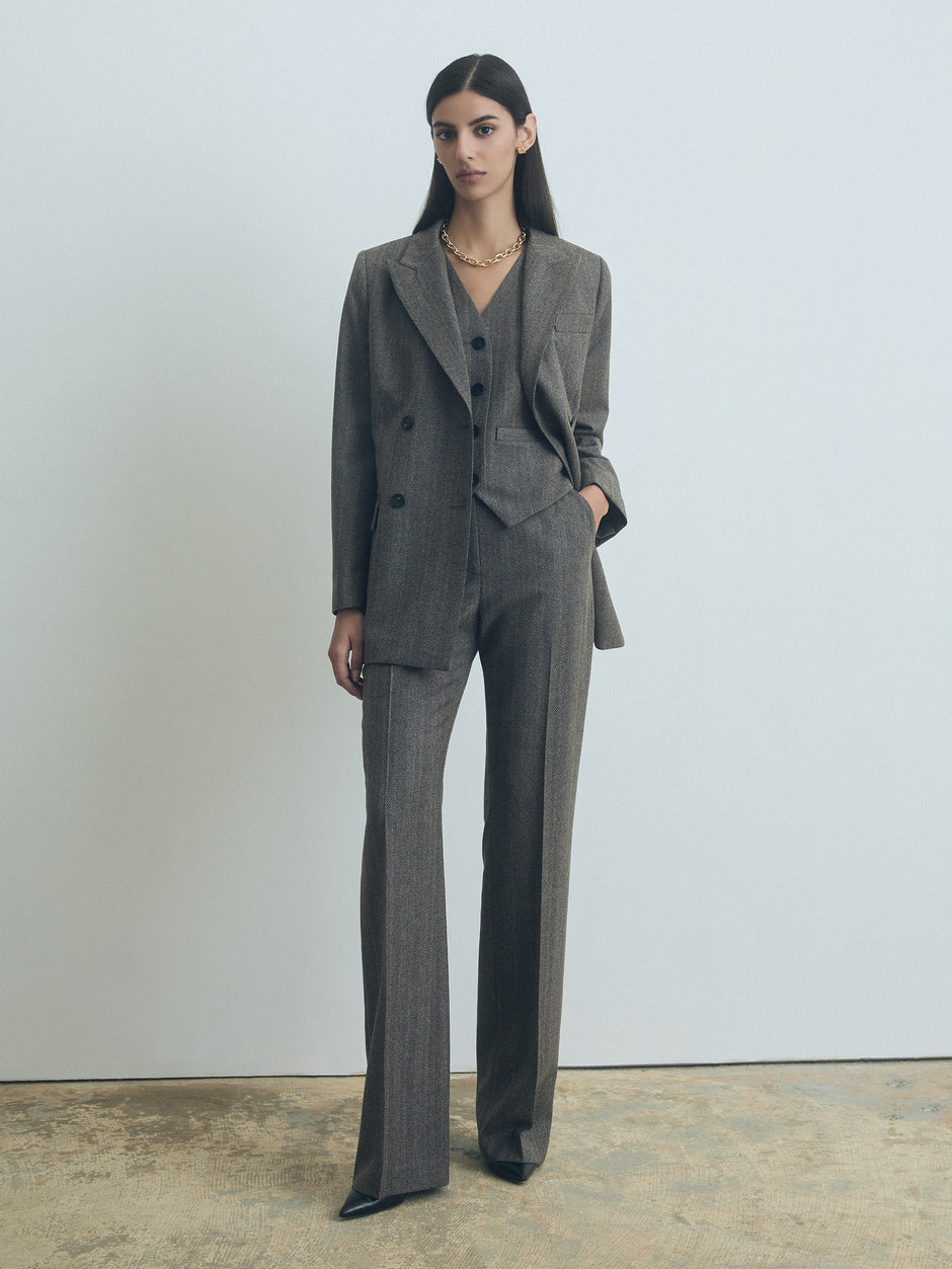 Slight fit-to-flare herringbone wool pants with slash and back welt pockets, made in Canada from Italian fabric