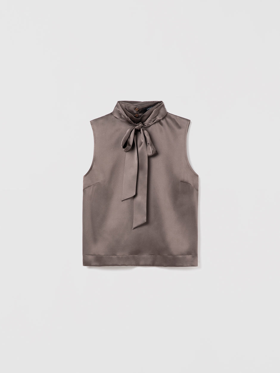 Sleeveless Mock Neck blouse with tie; keyhole button closure at back with tie scarf in silk fabric