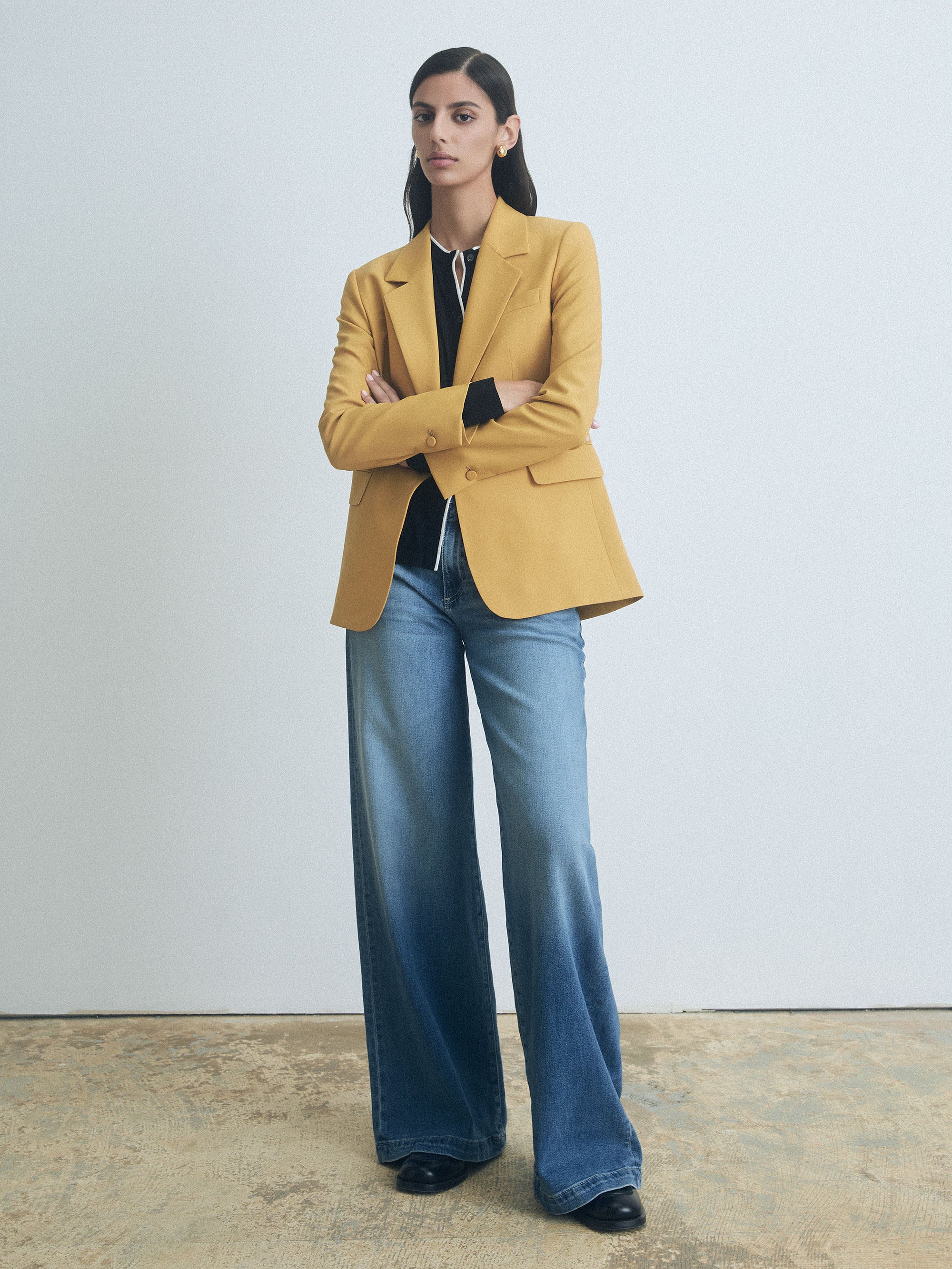 Structured virgin wool-blend jacket with a notch lapel, flap pockets, and self-covered buttons. Fully lined, with a single back vent.