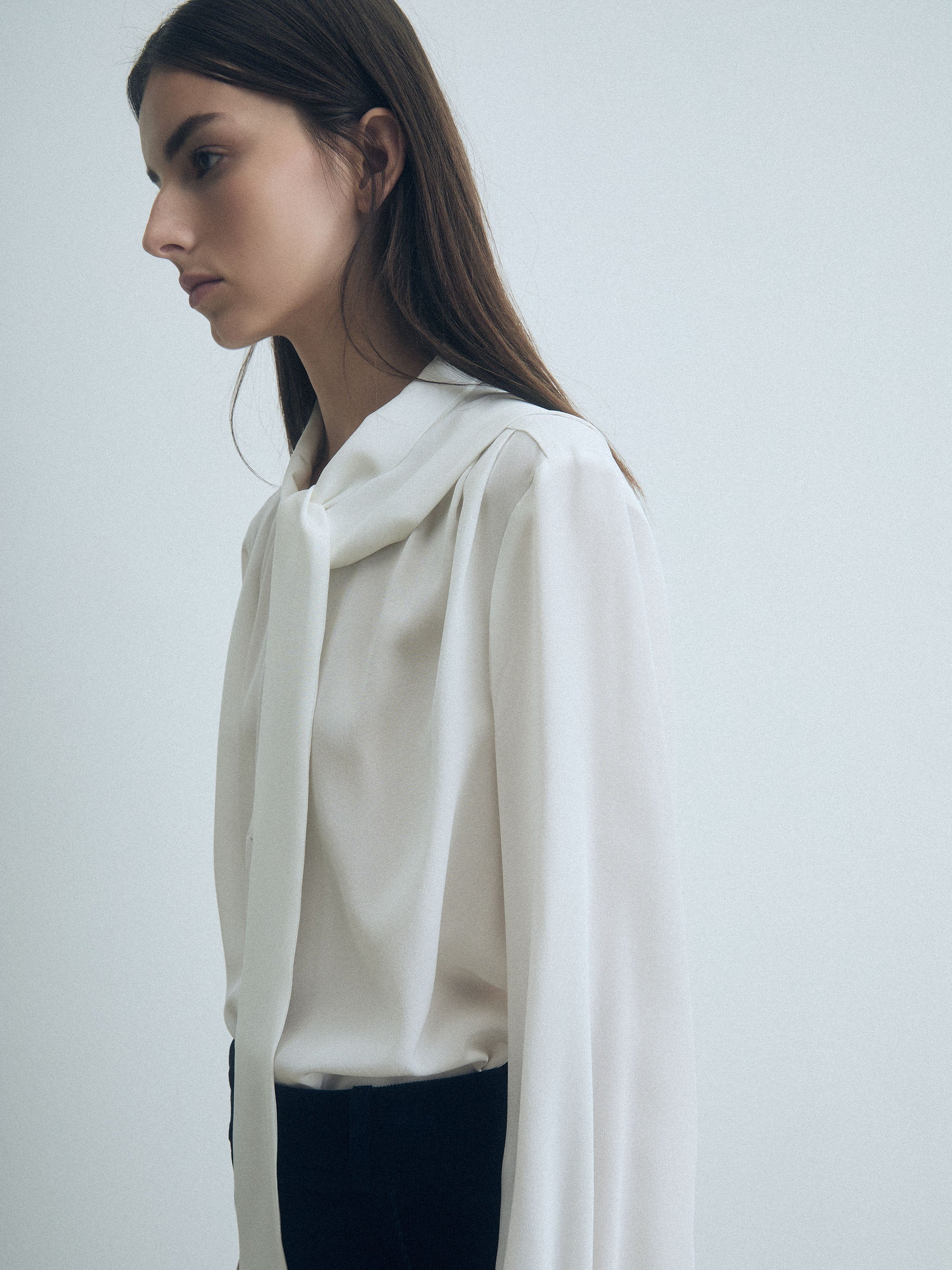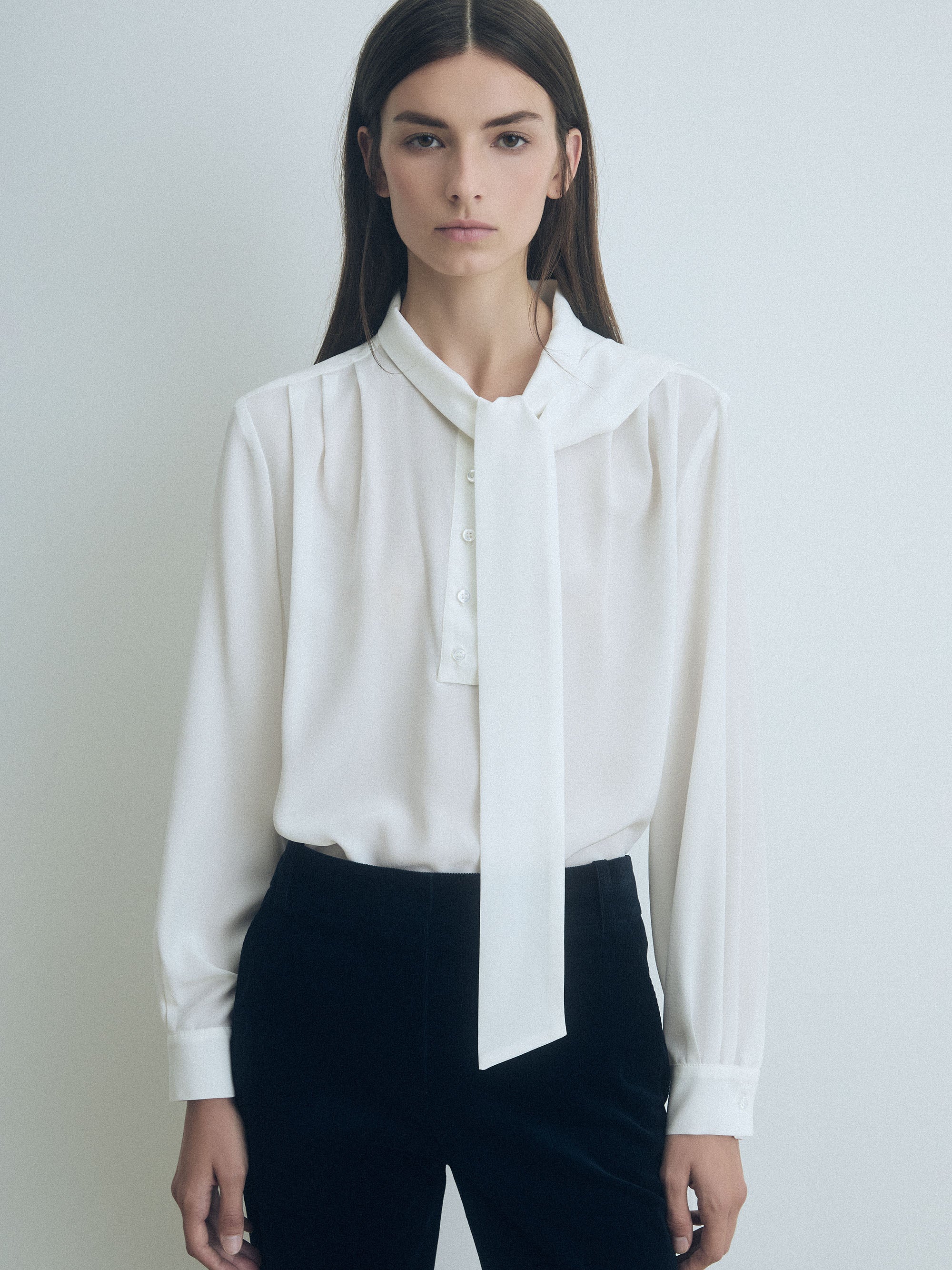 Silk blouse with button closure, pleated long sleeves, and neck tie.